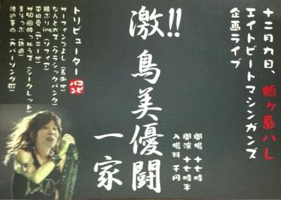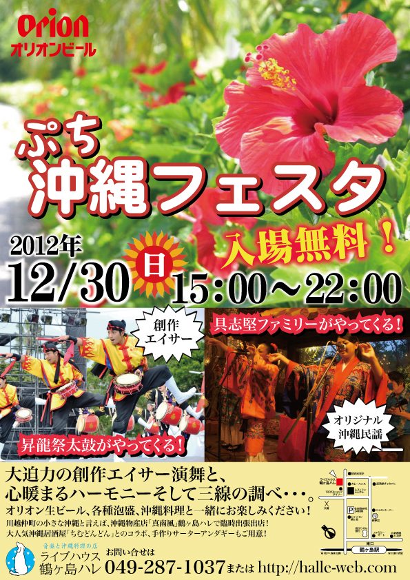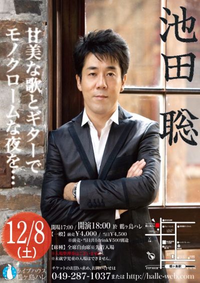 【会場】 鶴ヶ島 HALLE (埼玉県鶴ヶ島市五味ヶ谷7-7 ジョイビル2F) 【問合】TEL; 049-287-1037 (http://halle-web.com) 【時間】 開場/19:00 開演/20:00 【席種】全席自由席 ※整理券なし/先着入場 【料金】前売¥4,000 当日¥5,000 (別途1Drink¥500) 【学割】大学/専門学生 ※当日学生証提示要 前売¥3,000 当日¥4,000 (別途1Drink¥500) 高校生以下 ※当日学生証提示要 前売¥2,000 当日¥3,000 (別途1Drink¥500) 【通し】一般2日券 前売¥7,000 当日¥8,000 3日券 前売¥10,000 当日¥11,000 大学/専門学生 ※当日学生証提示要 2日券前売¥5,000 当日¥6,000 3日券前売¥7,000 当日¥8,000 高校生以下 ※当日学生証提示要 2日券前売¥3,000 当日¥4,000 3日券前売¥5,000 当日¥6,000 ※共に各日別途1Drink¥500 ※通し券各希望日にて、予約要