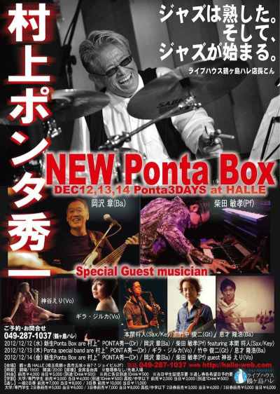 【日程及び出演】 2012/12/12(水) 新生Ponta Box are 村上PONTA秀一(Dr) / 岡沢 章(Ba) / 柴田 敏考(Pf) featuring 本間 将人(Sax/Key)
