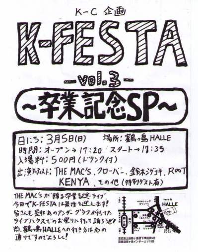 | ホールレンタル・ブッキング共に受付中 新型コロナ感染症対策とお客様へのお願い ※公演中のお食事提供を控えさせていただいております。 →開演前、終演後、休憩中などの時間にご用意いたします。 ※常時マスクの着用をお願いします。 ※大きな声での会話や声援はお控えください。 ※体調不良、発熱、風邪等の症状のある方はご入場をお断りしております。 イベントにつきましてはガイドライン遵守の上、打ち合わせ等を十分に行い開催いたします。 【公演予約方法】 ●ライブハウス鶴ヶ島HALLE 電話予約 049-287-1037 (受付時間12:00〜24:00) メール予約 ●プレイガイドe+ ※対象ライブのみ 【入場システム】 ●ライブ公演におきましては、別途ご入場時1ドリンク¥500を頂戴いたします。※記載のない場合は、この限りではありません。 ●ライブ内容により、全席着席又はオールスタンディング(※一部座席)となりますが、ライブ中もお食事はお楽しみ頂けます。 ●全公演先着入場ですが、公演により整理券配布を行う場合もございます。 ●2020年1/1より店内禁煙です。 ※弊店入口の喫煙コーナーをご利用ください。 ※当スケジュールが最新情報となりますので、ご来店の前に今一度ご確認くださいませ。 またリアルタイムで、FACEBOOK/TWITTERでも情報公開しておりますので、左上部のHALLE-WEBよりご利用ください。 *** 2003-2010年5月 スケジュール・アーカイブ ※過去データベース一部消失の為、現在随時復旧中です。 |