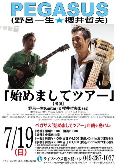 PEGASUSのライブの見所 ● 櫻井哲夫(bass)と野呂一生(guitar)によるアコースティック・デュオ・セッション。今年、レコードデビュー30周年を迎えたカシオペアの始動メンバーだった二人が、グループ名を決めるときに候補と成っていた幻の名を復活させ、全国ツアーを行います。様々なカバー曲を織り交ぜながら、お互いのオリジナル曲、思い出のあの曲この曲などを初公開のアコースティック・デュオで繰り広げます。全ての始まりだった二人のサウンドをどうぞお楽しみに!