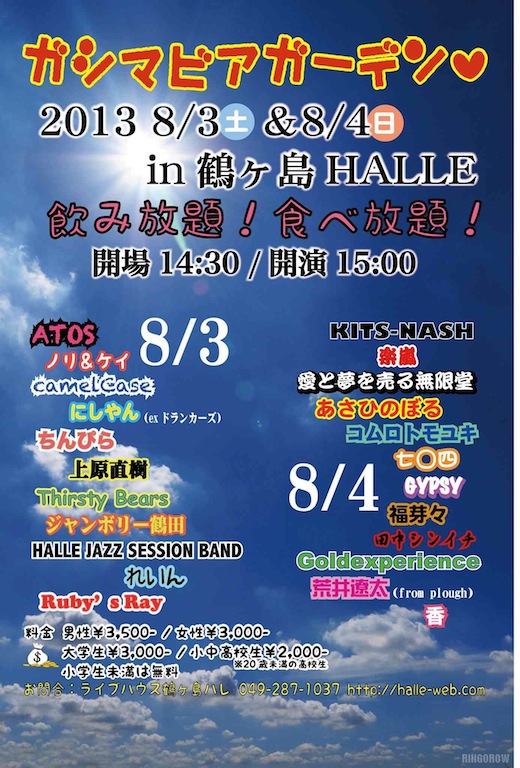 | 4 | 日 | | 14:30〜22:00 | ガシマビアガーデン*2日目*