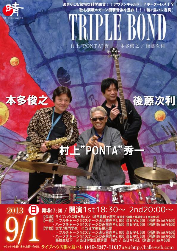| 1 | 日 | | 18:30〜 | TRIPLE BOND(村上”PONTA”秀一&本多俊之&後藤次利) CD発売記念ライブ