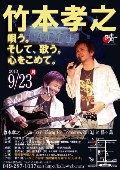 | 23 | 月 | 秋分の日 | 12:00〜 | 竹本孝之 Live Tour『Song for Tomorrow2013』in鶴ヶ島