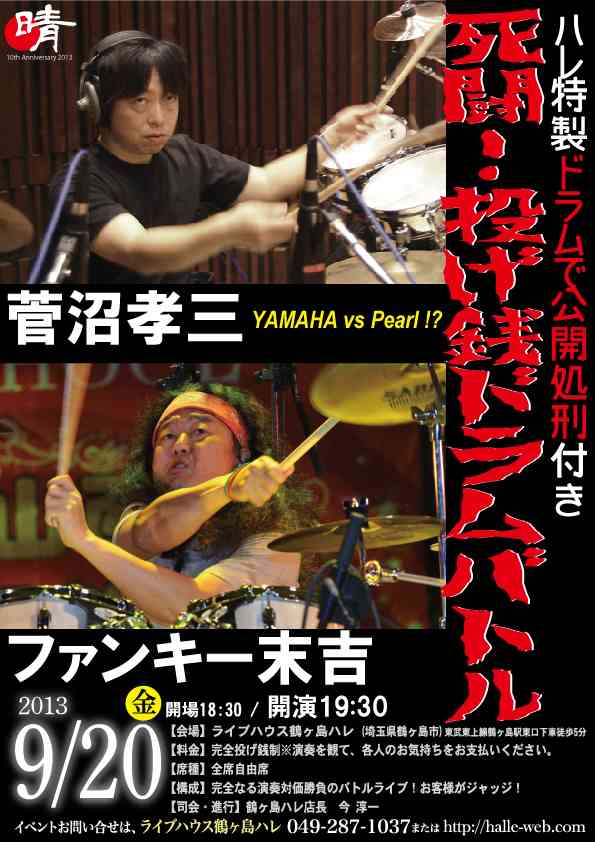 | 20 | 金 | | 19:30〜 | 菅沼孝三vsファンキー末吉 投げ銭ドラムバトル+ハレ特製オプション「ドラムで処刑」付き